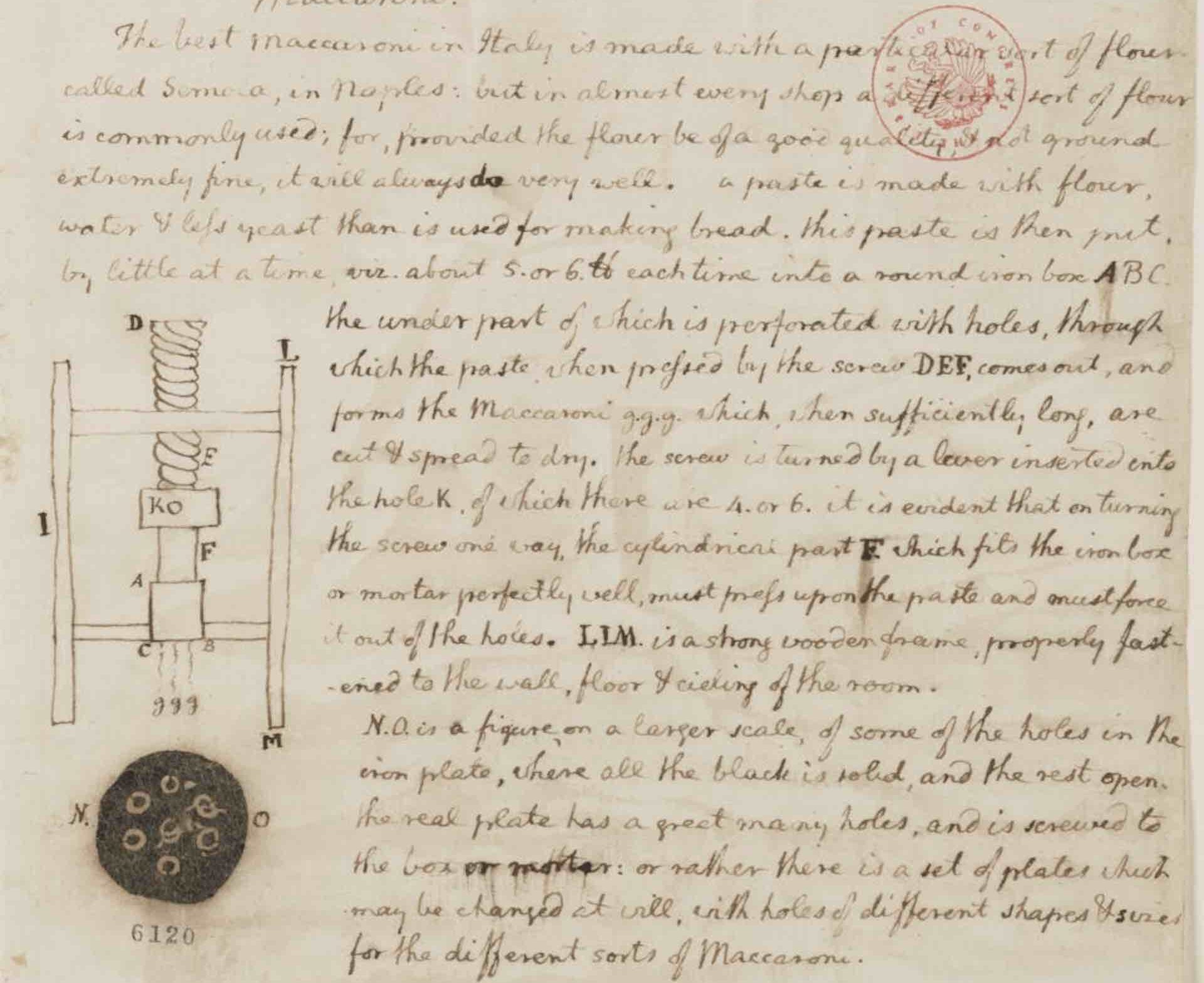 During a trip to Naples (my hometown) in 1787, Jefferson was fascinated by the pasta-making process, especially the “bronze man” press. He was so impressed that he brought a copy of the press back to the U.S. and documented the macaroni-making process in his notebook, which is now preserved in the Library of Congress (see the photo above). He noted that ”the best macaroni in Italy is made with a special flour called semola in Naples.”