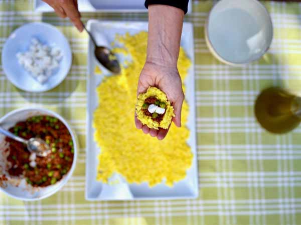 Similar to an orange fruit in shape and color, arancini is a fried ball of risotto. For this delicious recipe we’ll be using saffron risotto stuffed with mozzarella, meat ragu, and sweet peas.