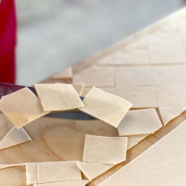 For pasta, you can choose any kind, but handmade maltagliati (“badly-cut” pasta) is fun and easy to make. You just need a knife to cut irregular rectangles once pasta sheets are rolled out.