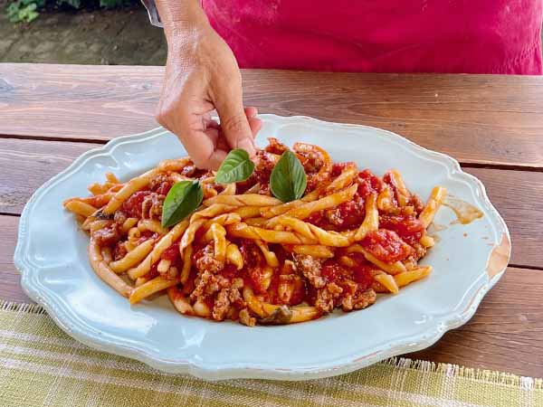 We’ll pair our homemade fusilli pasta with a hearty tomato-sausage ragu. I’ll teach you how to make a meat sauce that comes together much faster than the classic ragu, while still full of flavor.