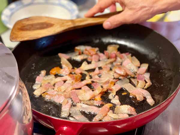 It’s made with a few basic ingredients: guanciale (cured pork jowl, which can be substituted with pancetta) and eggs. The chemistry between this couple guarantees an enduring love. Add cheese and pasta, and the harmony is perfect.