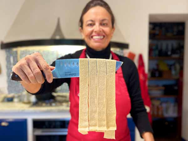In this class, we’ll make this unique pappardelle pasta starting from fresh, homemade pasta dough and rolling it out with a pasta machine. I’ll teach you my trick to leave a little bite to the pasta.