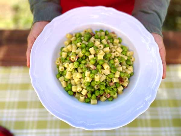 Small pasta, typically tubetti, are cooked in a pea soup base, similar to a risotto. The starch of the pasta provides the creaminess without adding any cream, just a generous amount of grated cheese.