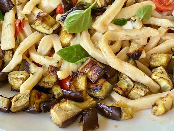 A typical summer pasta, usually seasoned with seafood, it’s also excellent with any vegetables or meat sauce. For the class, we’ll use grilled eggplants and fresh tomatoes while they’re in season.