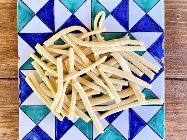 We’ll make the dough together, mixing milk and flour (yes, milk instead of water!) and add fresh basil leaves to give a special aroma to the pasta. The shape is like fettuccine, but shorter and thicker and can be easily made with a pasta machine or a rolling pin.