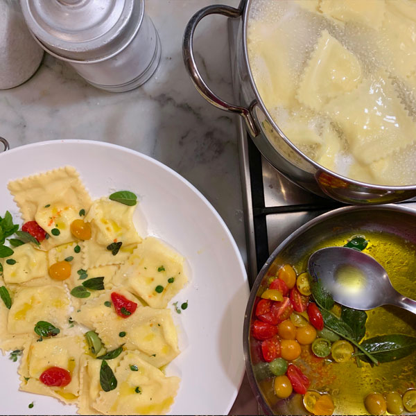 We’ll serve them with Burro e Salvia, butter and sage, a much-loved pair in Italian cuisine. We’ll add few cherry tomatoes for more flavor and to honor the Italian flag colors: green, white and red!